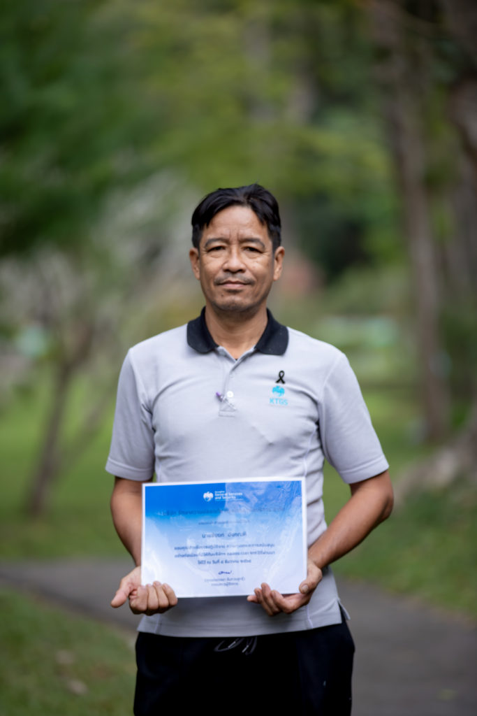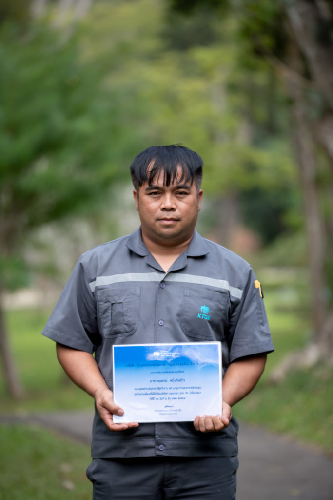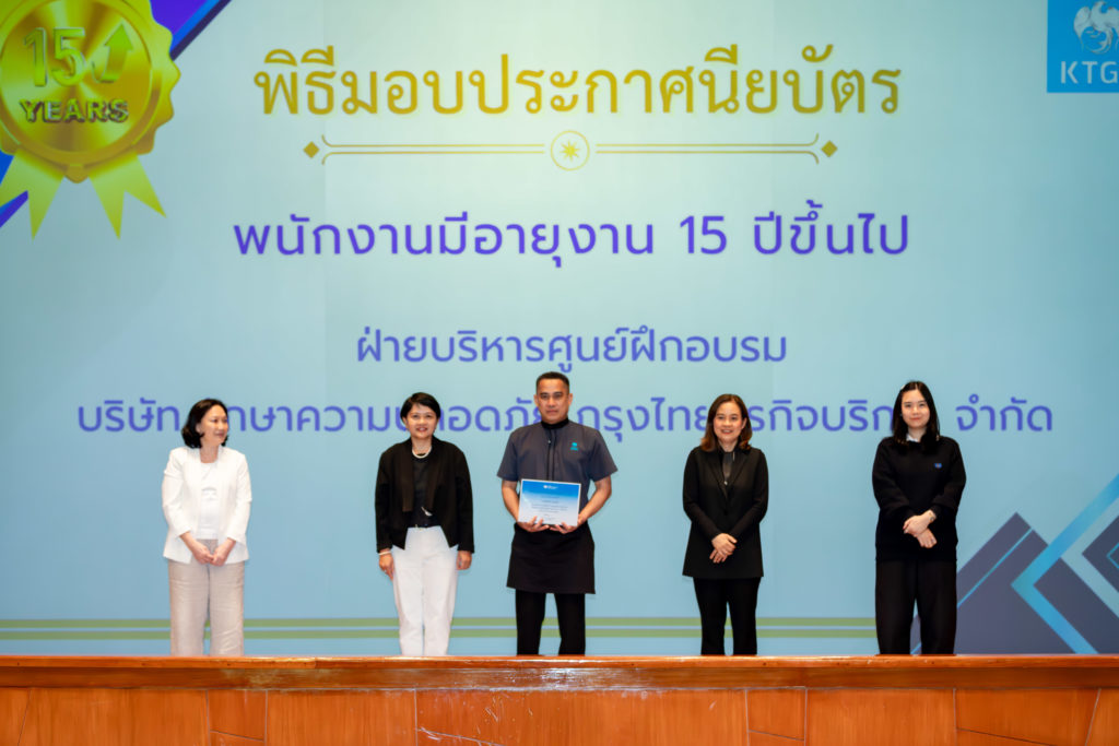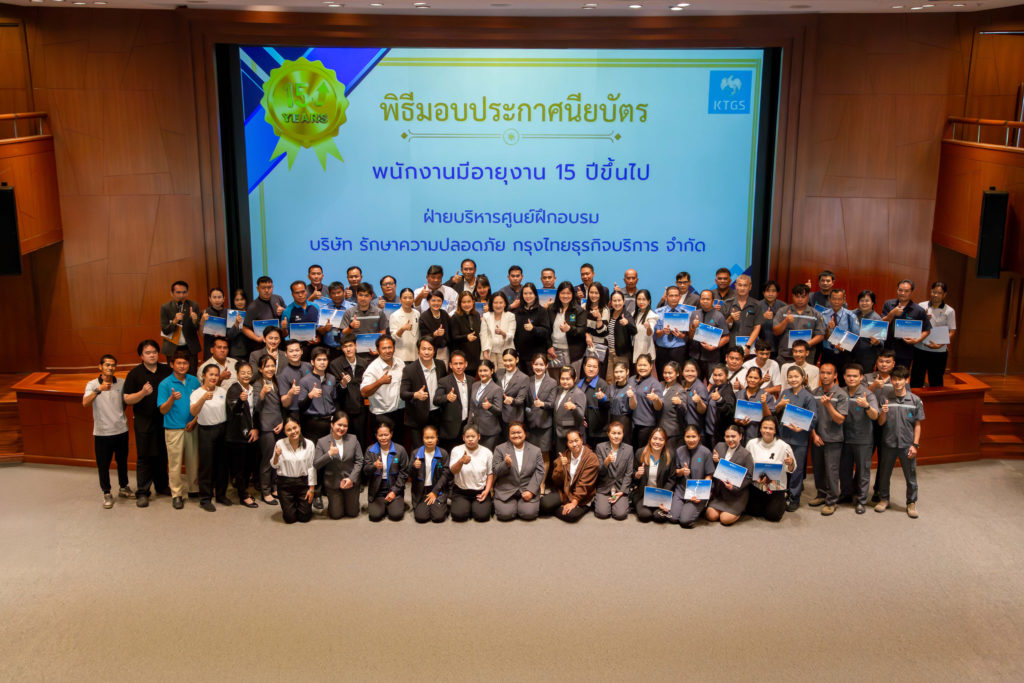 สำหรับกิจกรรมในช่วงบ่าย เป็นพิธีมอบประกาศนียบัตรและของที่ระลึกเพื่อเชิดชูเกียรติแก่พนักงาน KTGS ผู้ทุ่มเทปฏิบัติงานโดยมีอายุงานตั้งแต่ 15 ปีขึ้นไป ซึ่งบรรยากาศเต็มไปด้วยความปิติยินดีและภาคภูมิใจ โดยพนักงาน KTGS ต่างยึดมั่นในค่านิยมองค์กรที่จะส่งมอบบริการที่ดีให้แก่ธนาคารกรุงไทยด้วยความตั้งใจจริง ภายใต้หลักการ “2 มือ 1 ใจ” ประกอบด้วย มือสะอาด มืออาชีพ และใจบริการ ซึ่งเป็นหัวใจสำคัญในการทำงานเพื่อส่งมอบประสบการณ์ที่ดีที่สุดสร้างความประทับใจให้แก่ผู้ใช้บริการเสมอมา
